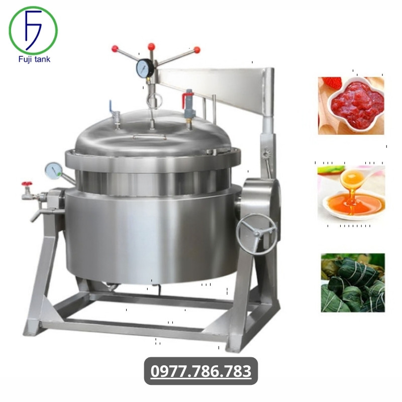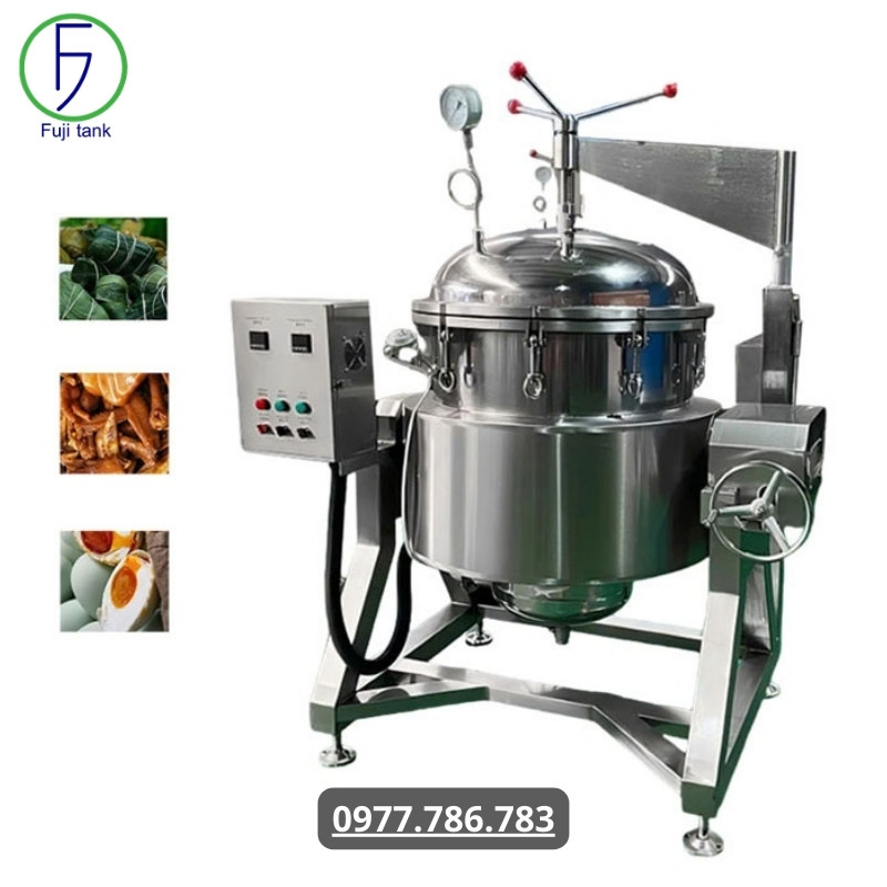 - Tối ưu hóa công năng: Tư vấn thêm các phụ kiện như cánh khuấy, hệ thống nâng hạ nắp bằng thủy lực hoặc tủ điện tự động hóa hoàn toàn (PLC) để phù hợp với đặc thù từng loại thực phẩm.